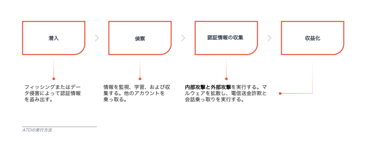 ATOとは、IDの盗難や詐欺の一種であり、悪意のある第三者がユーザの認証情報に正常にアクセスできるようにします。攻撃者は、ブランドインパーソネーション、ソーシャルエンジニアリング、およびフィッシングを悪用して、認証情報を盗み出し、メールアカウントにアクセスします。また、アカウントを乗っ取ると、企業のビジネスの運営方法、メール署名、および金融取引の処理方法を知るために、行動を監視および追跡します。攻撃者は、ATOを悪用して、他のアカウントの認証情報を盗み出すなどの攻撃を実行します。ATOの別名:アカウント侵害。
