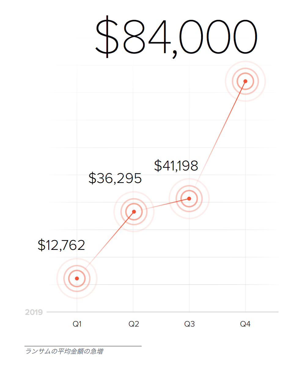 マルウェアの94%はメールで拡散します。2019年、ランサムウェアによる損害は、1,700億ドルに達した可能性があります。2019年、ランサムの平均金額は、第3四半期の41,198ドルから第4四半期の84,000ドルと、2倍以上に増加しました。 |