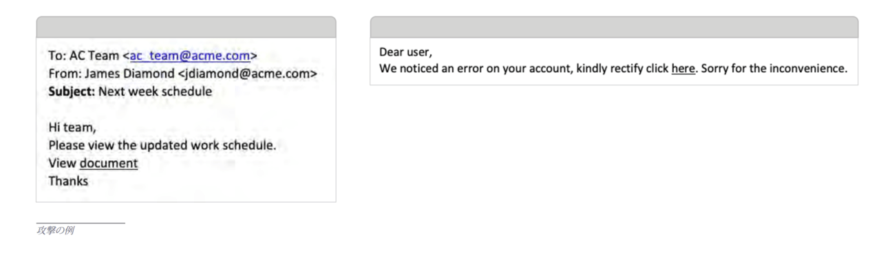 会話乗っ取りはATOの一部の可能性があります。攻撃者は、ビジネス運営を理解し、進行中の取引、支払手続きなどの詳細について学習するために、時間をかけて、メールを読んで、乗っ取ったアカウントを監視します。